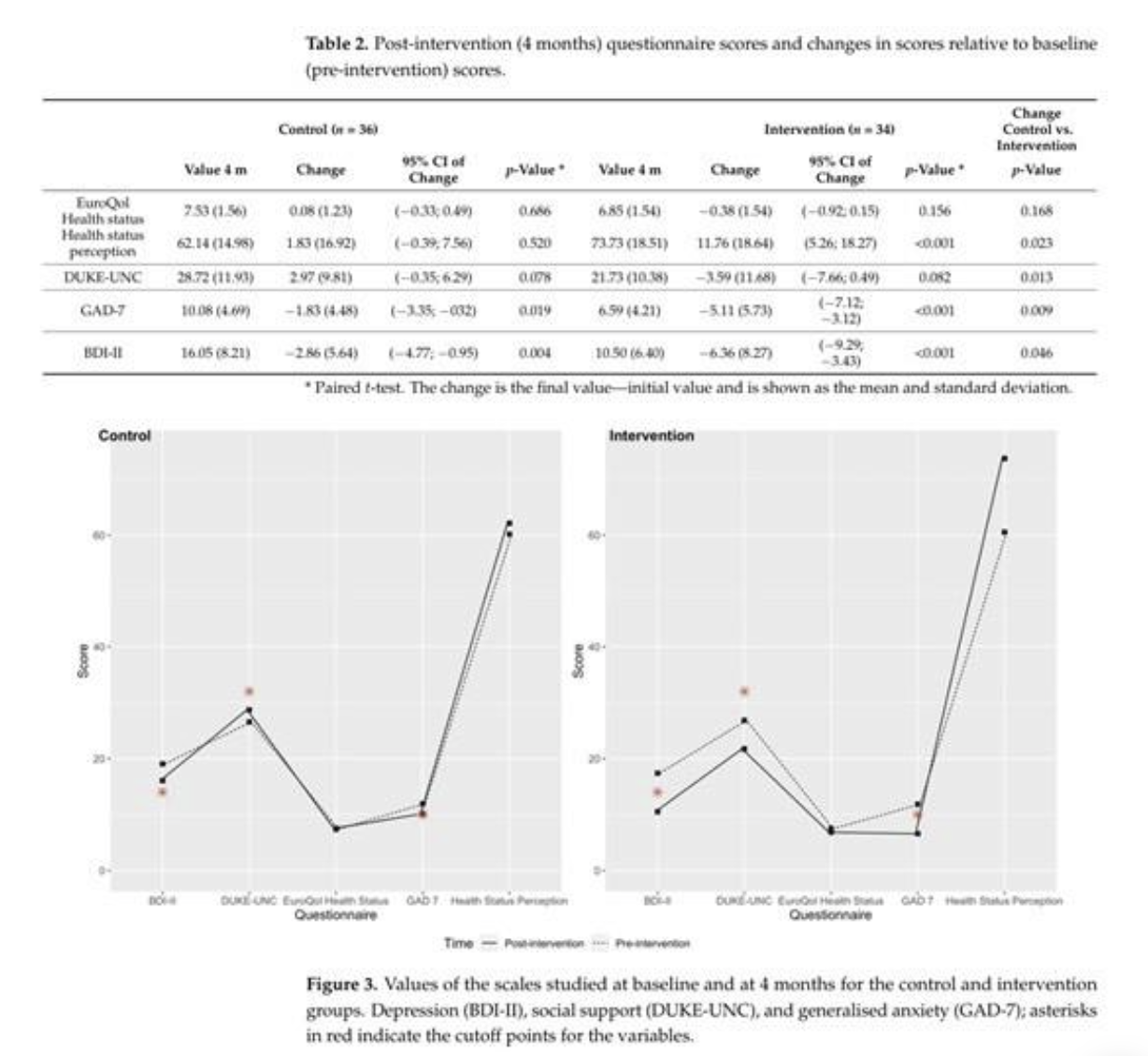 Després de la intervenció hi va haver diferències significatives al grup intervenció (GI), amb la millora de la depressió, l'ansietat, la percepció de l'estat de salut i el suport social.